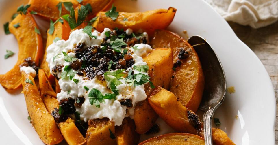• Verdeel de geroosterde pompoen over een schaal